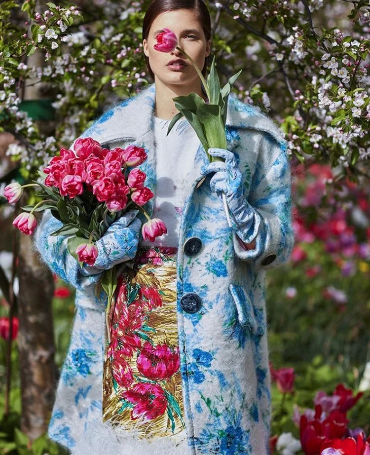 /Model Julia Van Os stars in 'Tiptoe Through The Tulips', a visual extravaganza styled by Joanna Hillman. Photographer Daniel Riera flashes Julia for Harper's Bazaar US August 2017./ Hair by Alexander Soltermann; makeup by Maria Martinez