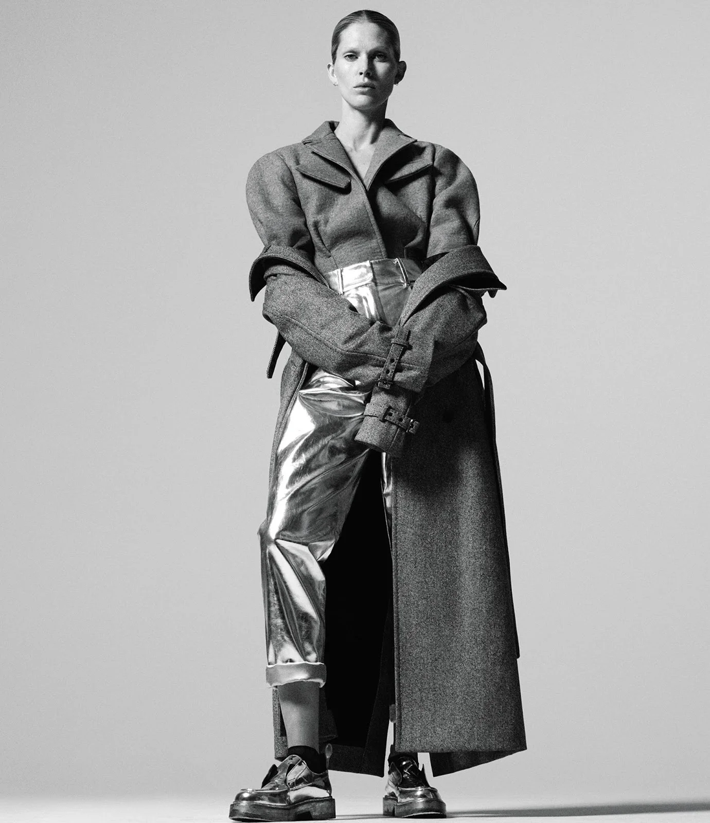 Menswear separates get some glitz, styled by Geraldine Saglio on model Iselin Steiro. Photographer Daniel Jackson flashes Iselin for WSJ Magazine September 2017 in 'Metallic Shimmer'./ Hair by Esther Langham; makeup by Diane Kendal