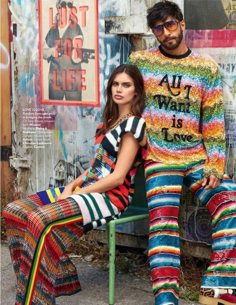 /Top model and Victoria’s Secret Angel Sara Sampaio feels the love, posing with Bollywood actor Ranveer Singh in the October 2018 11th anniversary issue of Vogue India. Anaita Shroff Adajania styles Sara in Ranveer in vivid prints and patterns for images by Greg Swales.