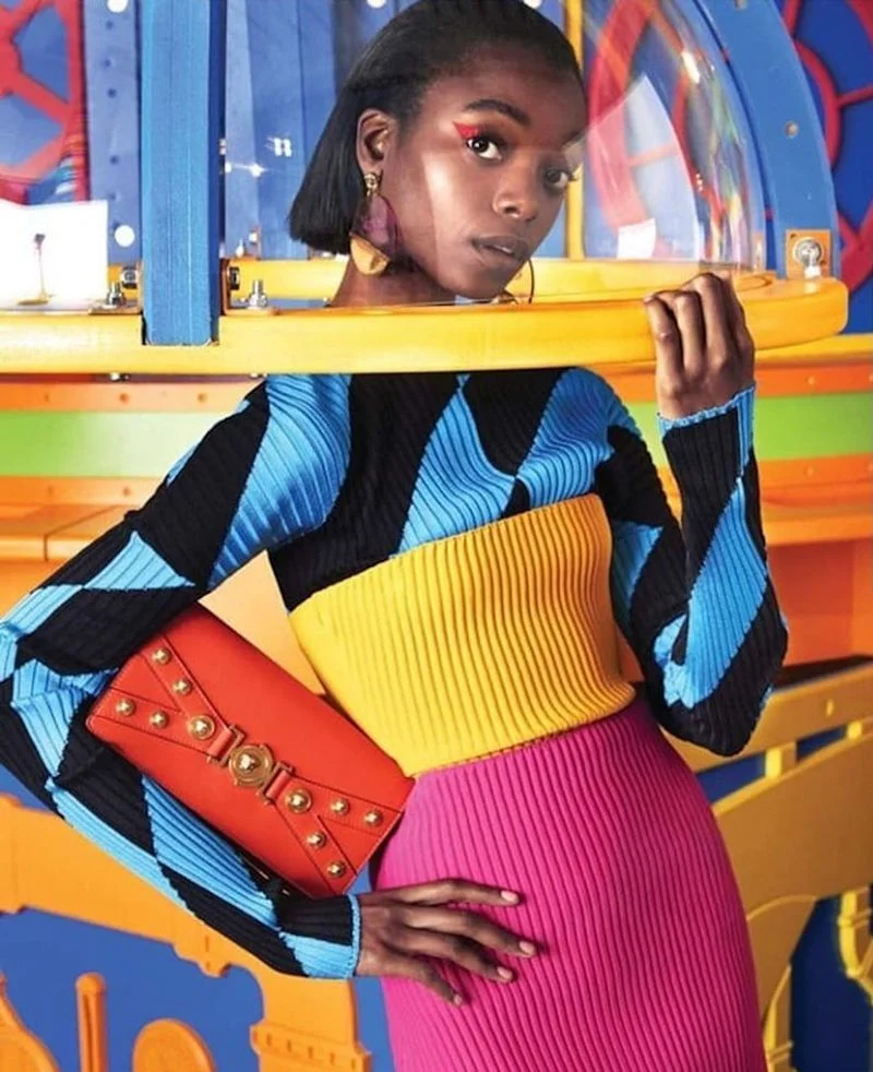 /Model Olivia Anakwe wears supersaturated, bold colors in ‘Eye Candy’, styled by Miguel Enamorado. Photographer Victor Demarchelier is behind the lens for Harper’s Bazaar US December 2018./ Hair by David von Cannon; makeup by Yuki Hayashi