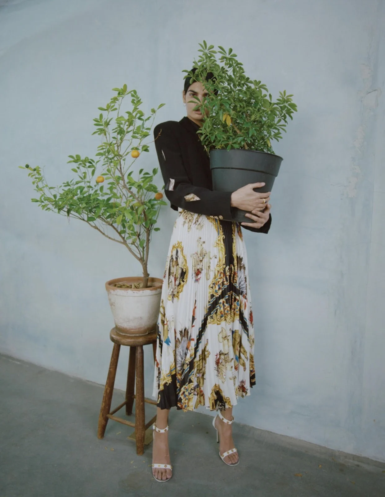 /Photographer Nadine Ijewere captures model Bhumika Arora, styled by Laura Stoloff in 'Pattern Play' for WSJ Magazine March 2018./ Hair by Junya Nakashima; makeup by Chichi Saito