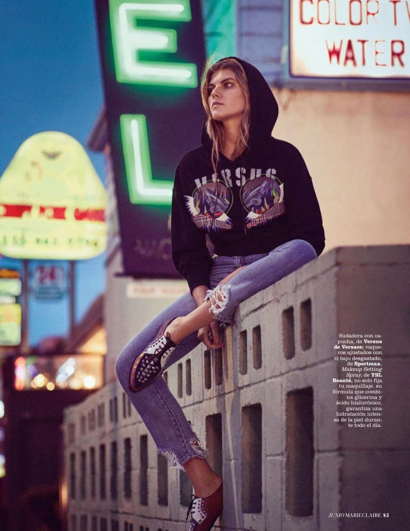 /Top model Maryna Linchuk heads to 'small town America', symbolized by the Hollywood Premiere motel in LA. Stylist Jennnifer Bauser chooses denim looks from Valentino, Prada, Stella McCartney and more for 'Rodeo Drive', lensed by Sergi Pons for Marie Claire Spain June 2018.