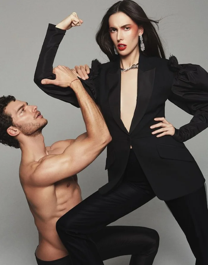 /Model Ruby Aldridge is pure lady boss, styled by Amarsana Gendunova in Versace, Chanel and more made-to-be seen designer labels for 'Power Play'. Photographer Shxpir captures Ruby in the company of Aurelien Muller for Vogue Taiwan May 2018./ Hair by Clay Nielsen; makeup by Liset Garza