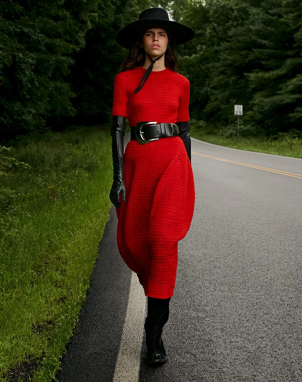 /Model Hayett McCarthy is styled by Bernat Buscato as the lady in red, lensed by Louis Christopher for Vogue Arabia September 2018./ Hair by Kenshin Asano; makeup by Fumi Makeup
