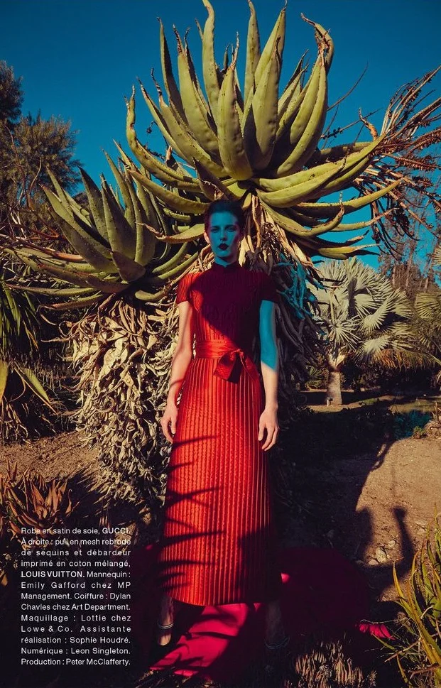 /Model Emily Gafford is styled by Samuel Francois in ‘Mirage’, a vibrant color mix of modern looks from Marc Jacobs, Louis Vuitton, Balenciaga, Moschino and more. Sofia Sanchez and Mauro Mongiello flash the fashion scene against a southwestern desert backdrop for Numéro France February 2019.