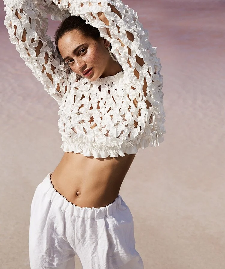 Model Catriona Frean wears pristine whites, tailored-femininity for hot weather days styled by Anouk Van Griensven. Photographer Katelijne Verbruggen captures the seaside beauty for Marie Claire Netherlands May 2018./ Hair & makeup by Suzanne Verberk