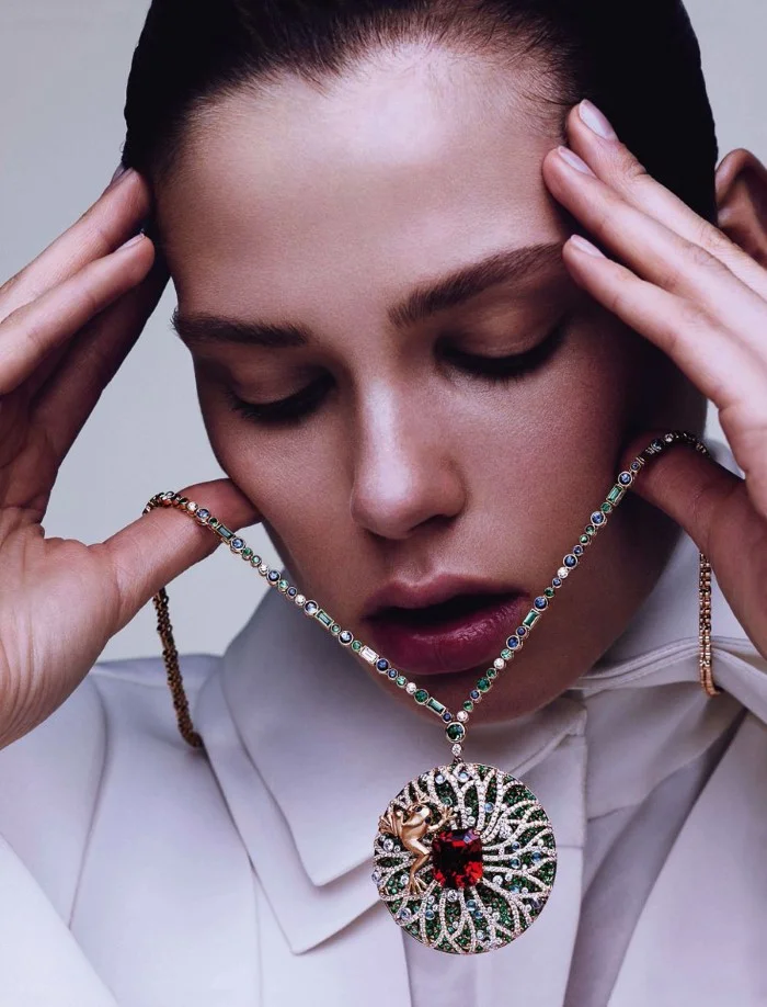Model Julia Bergshoeff is styled by Morgane Bedel and Marie Pasquier in’City Lights’ luxe jewels lensed by Ben Hassett for Vogue Paris September 2019./ Makeup by Lynsey Alexander; hair by Sam McKnight