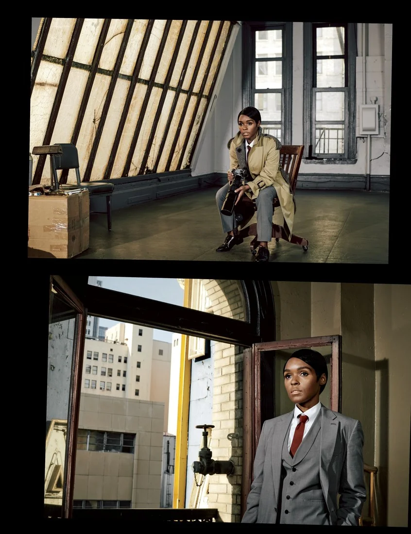 Talent Janelle Monae is styled by Sara Moonves in 'Noir Town", lensed by 'Get Out' director and writer Jordan Peele for W Magazine Vol. 2 2018./ Hair by Nikki Nelms; makeup by Dick Page