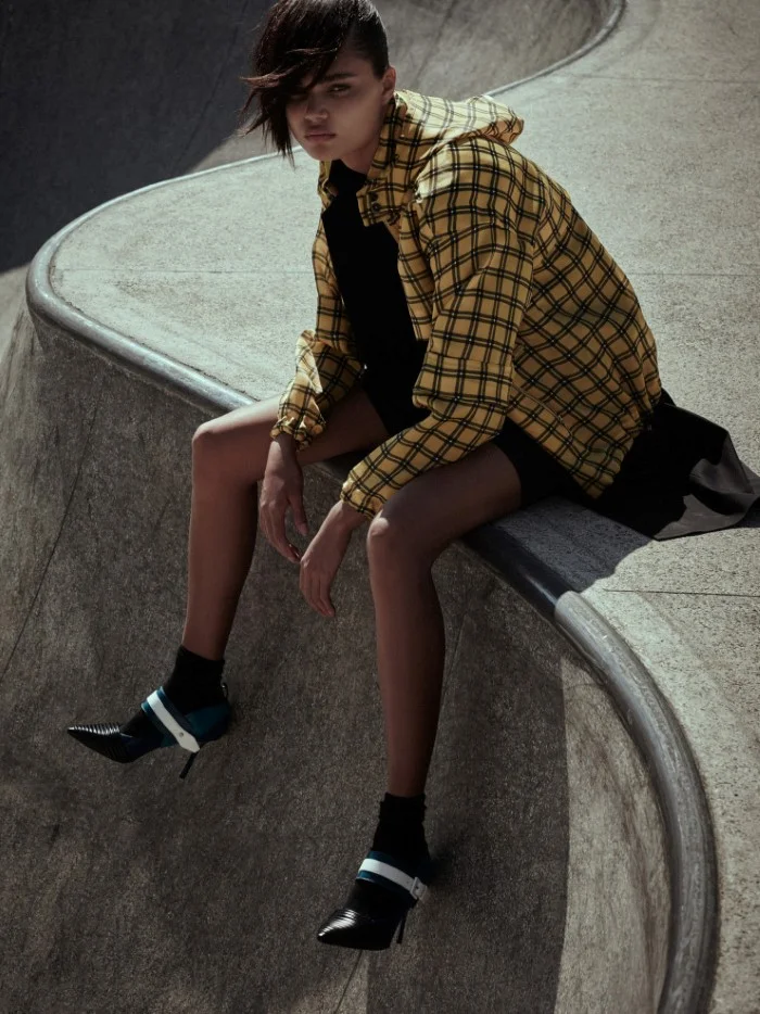 /Model Vasilisa Pvlova is styling in modern architecture design for L’Officiel Brazil’s February issue. Andre Passos makes the colorblocked, playground fashion capture ‘Grafismo Brinks’, styled by Vanda Jacinthol.