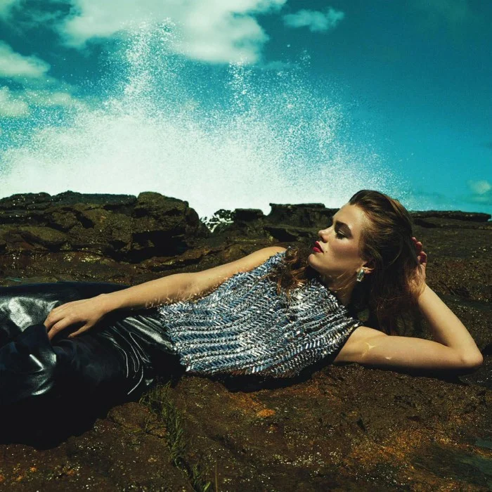 Photographer Will Vendramini flashes model Mathilde Brok Brandi for Intermix Holiday Campaign./ Hair by Owen Gould; makeup by Eric Polito