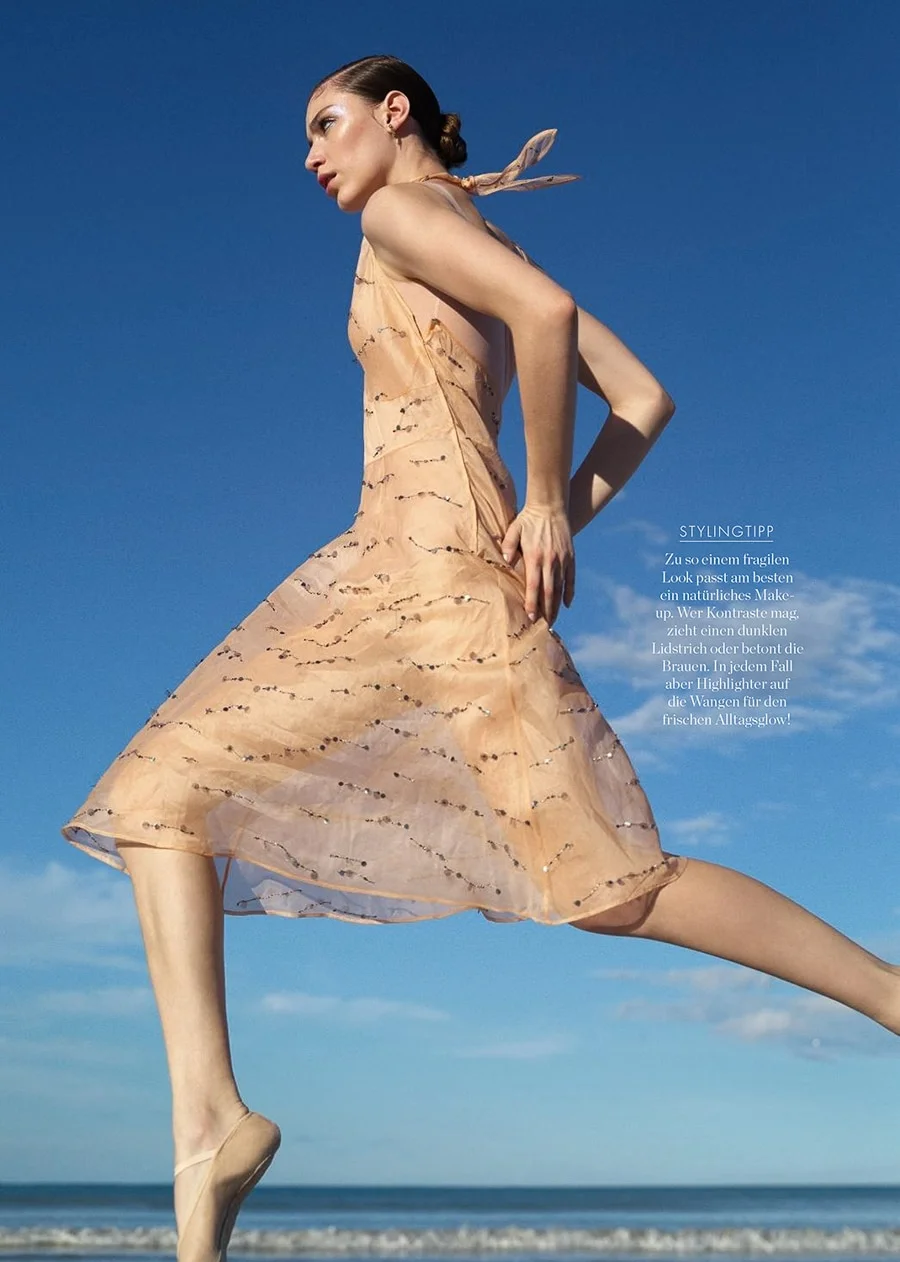 /Model Sofia Tesmenitskaya is airborne, styled in 'Ballerina' by Astrid Doil. Photographer Enrique Badulescu is behind the lens for Elle Germany March 2018./ Makeup by Deanna Melluso for NARS; hair by Leonardo Manetti for ION Studio NYC