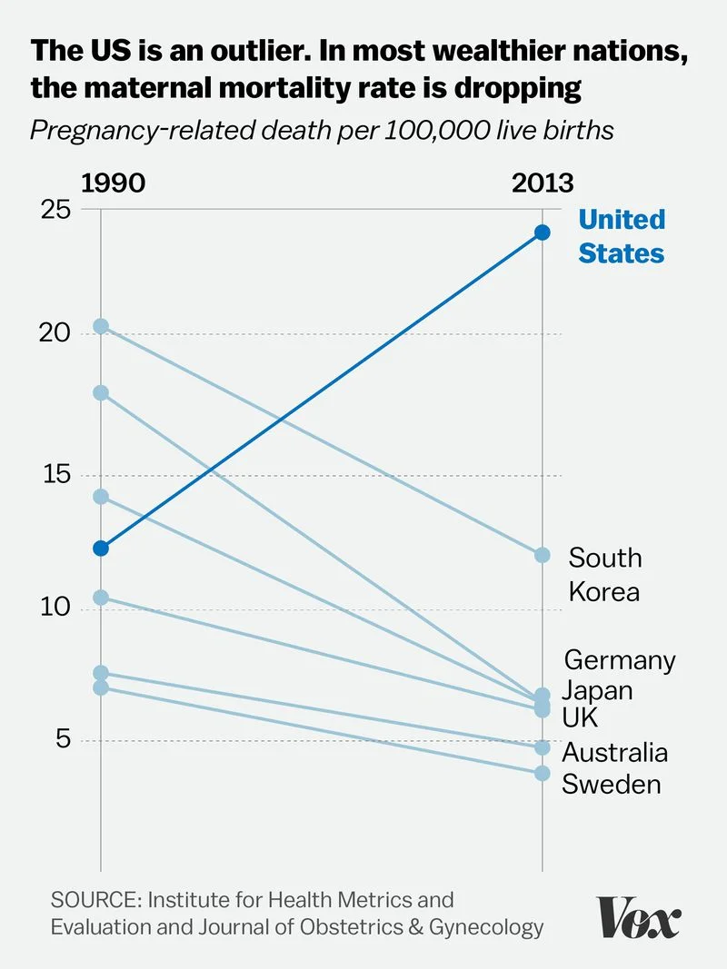 Between 2000 and 2014, maternal deaths soared by 27 percent to 24 per 100,000 in America.. That rate is three times the rate of the United Kingdom and about eight times that of Netherlands, Norway and Sweden, writes Vox.