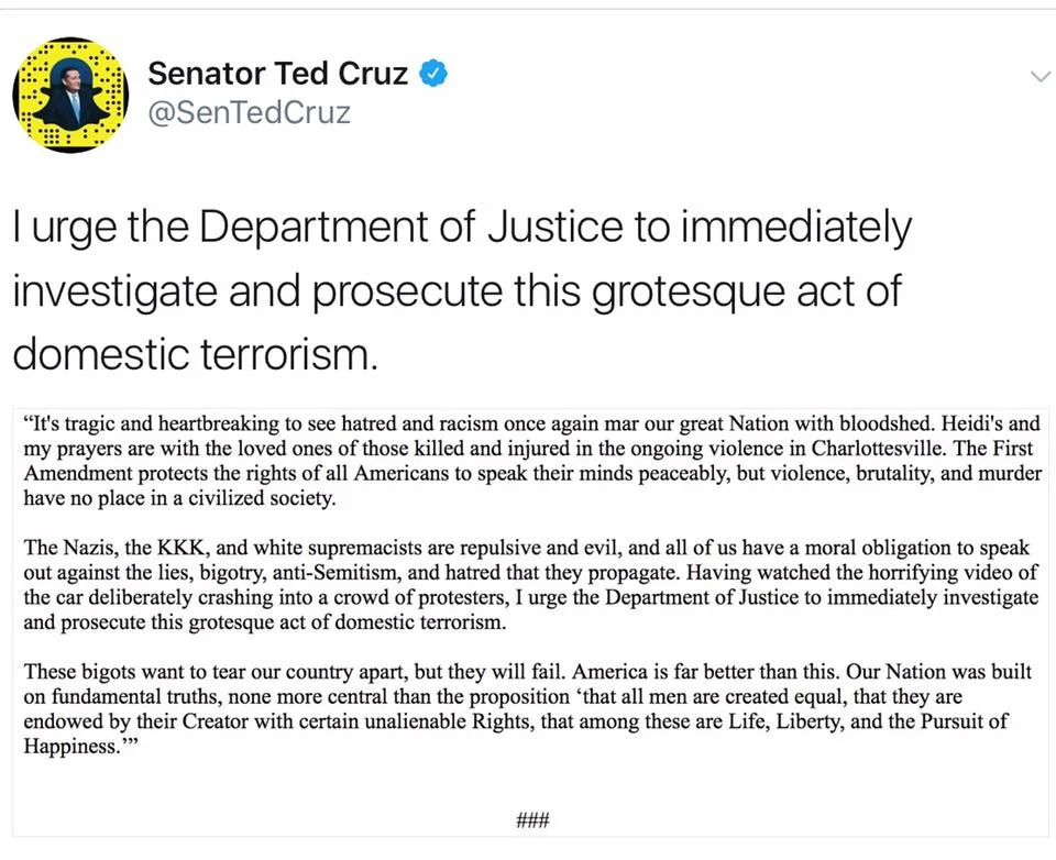 Sen. Ted Cruz Calls Out Nazis, The KKK & White Supremacists In Act Of Domestic Terrorism