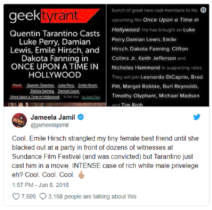 “Cool,” Jamil wrote on social media. “Emile Hirsch strangled my tiny female best friend until she blacked out at a party in front of dozens of witnesses at Sundance Film Festival (and was convicted) but Tarantino just cast him in a movie.” She added, “INTENSE case of rich white male privilege eh? Cool. Cool. Cool.”