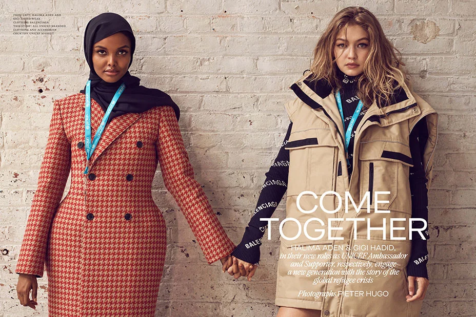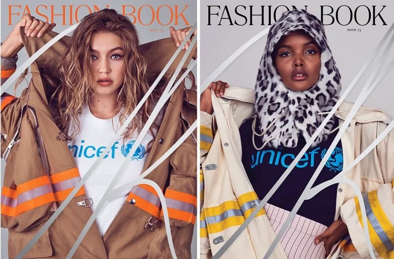 /Models Gigi Hadid and Halima Aden cover CR Fashion Book Issue 13, an issue dedicated to UNICEF USA, according to editor Carine Roitfeld. Carine broke away from the fashion pack with her fall issue, dedicated to doing good by raising awareness for the global children's relief organization with two of its newest ambassadors Hadid, the half Palestinian daughter of a Syrian refugee and Aden, a Somali refugee and prominent Muslim, hijab-wearing model.