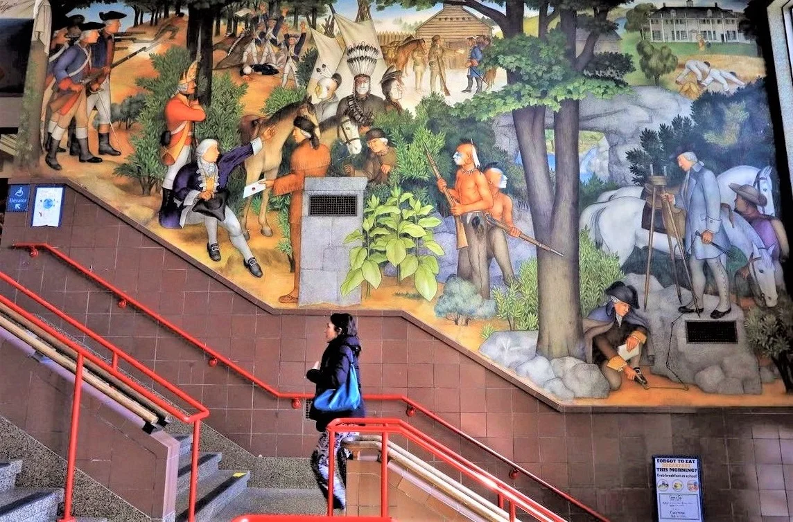 It identified two panels as especially offensive. One shows Washington pointing westward next to the body of a dead Native American. The other depicts slaves working in the fields of Mount Vernon.