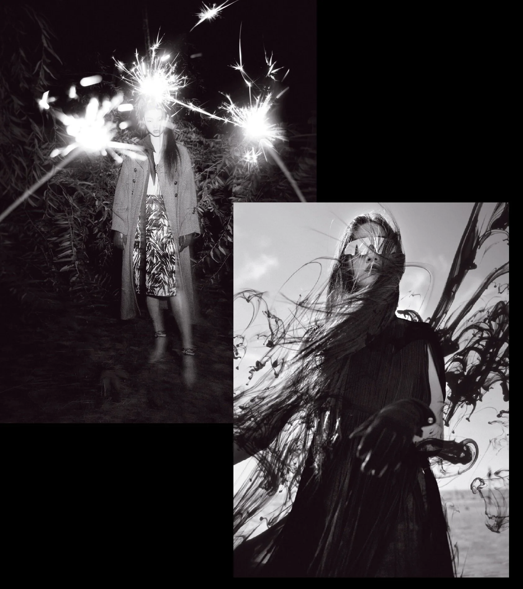 Models Yoon Young Bae and Hyunji Shin are styled by Yejin Lee in ‘Surreal Noir’, lensed by Hyea W. Kang for W Korea December 2020.