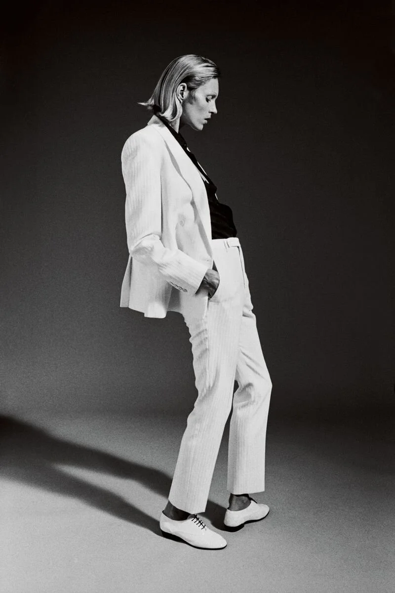Model Anja Rubik is styled by Sheila Single in a Saint Laurent by Anthony Vaccarello fashion story. Photographer Camille Vivier is behind the lens for Purple Fashion Magazine #33 The Brain issue. /