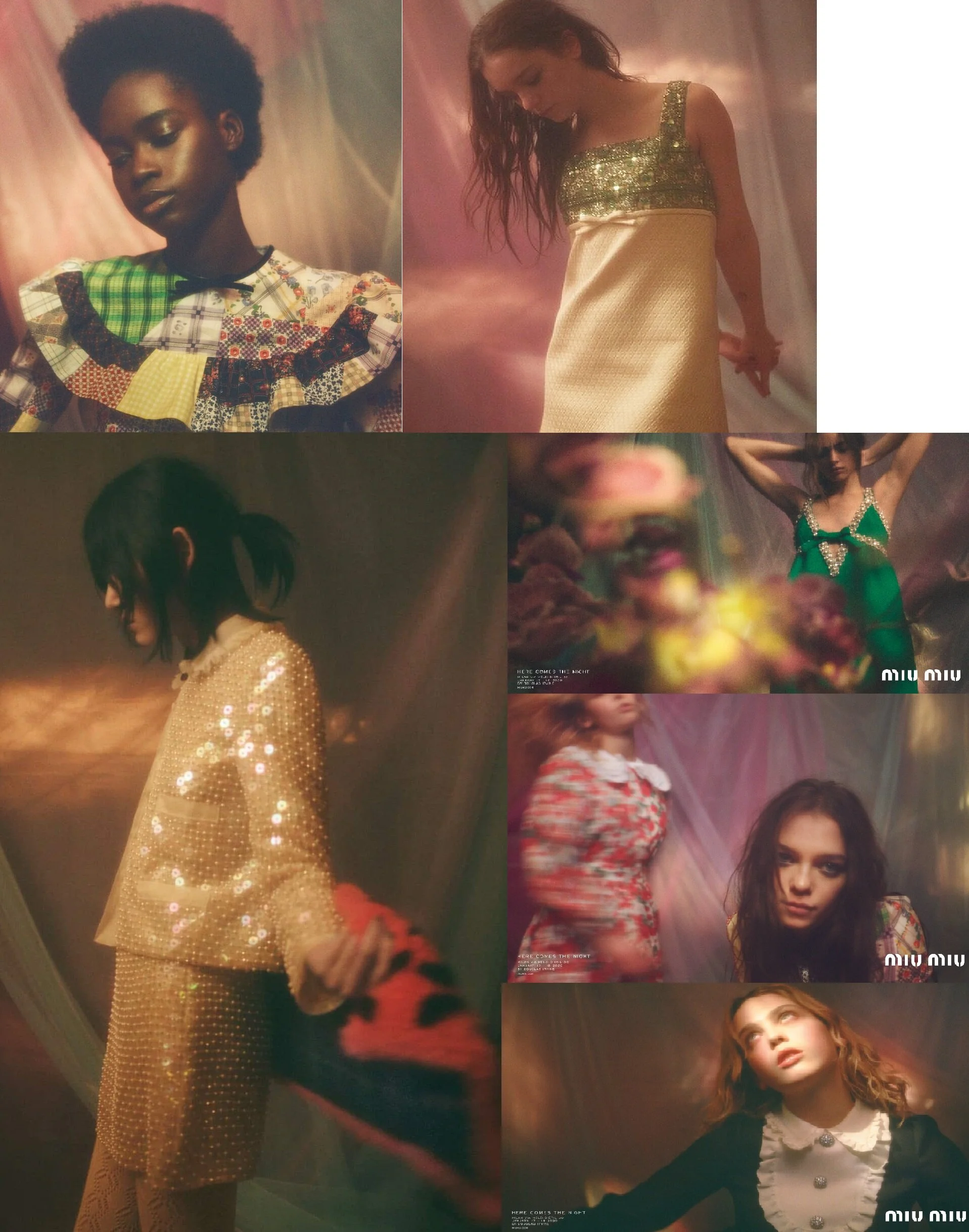 Photographer Douglas Irvine immerses our gaze into the hyper-feminine atmosphere of Miu Miu’s Pre-Fall 2020 Campaign ‘Here Comes the Night’. Katie Grand styles the pre-COVID-19 shoot with models Ez, Kasper Kapica, Malaika Holmen, Patrycja Piekarska, Tang He, Tomiwa Adeshina and actor Esme Creed-Miles. / Casting direction by Anita Bitton; hair by Samantha Hillerby; makeup by Miranda Joyce