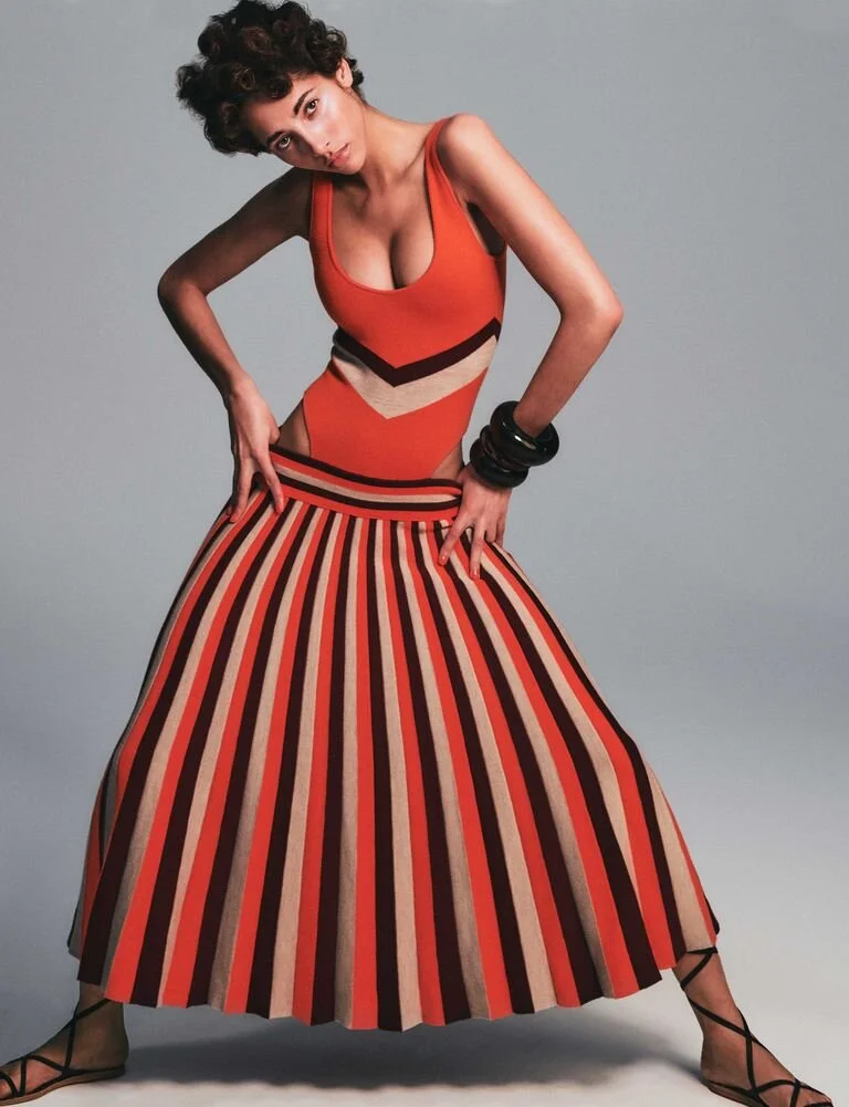 Model Yasmin Wijnaldum poses in Gabriela Hearst Spring 2021 designs, styled by Alex White. Photographer Chris Colls is in the studio for ELLE US April 2021./ Hair by Orlando Pita; makeup by Frank B
