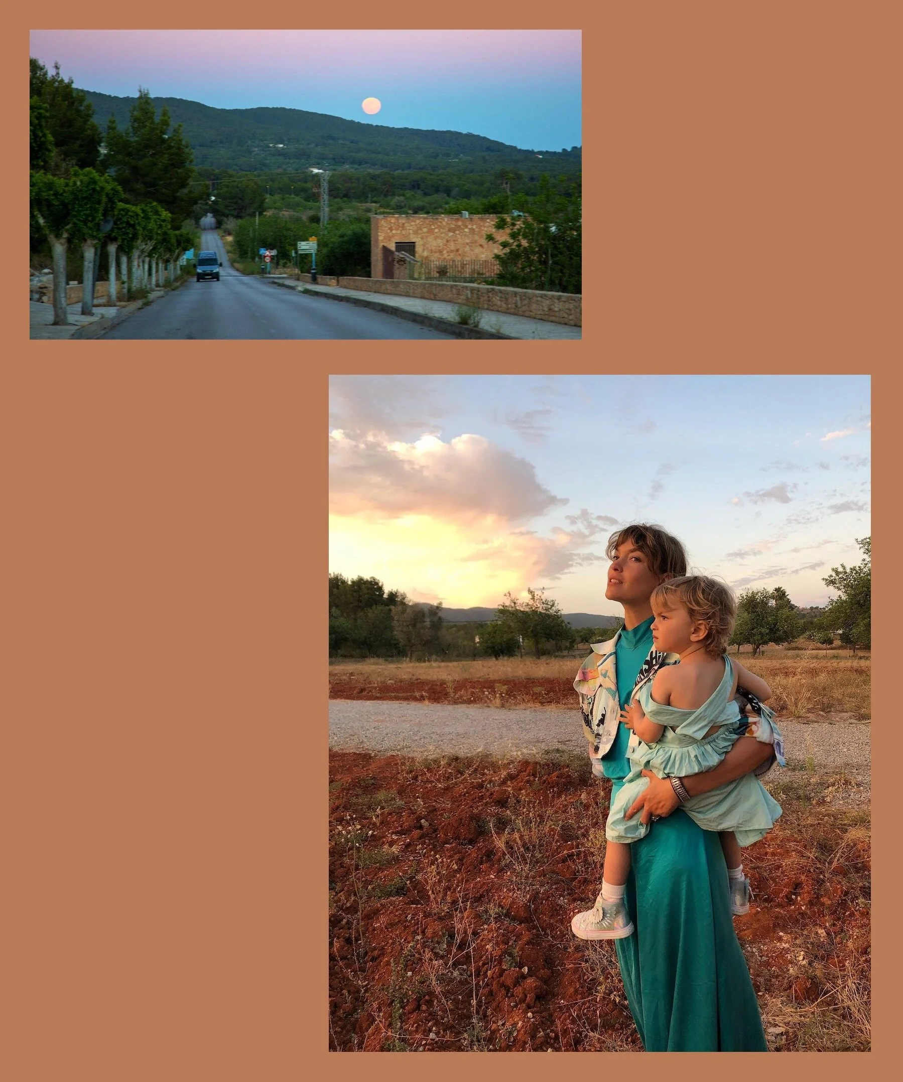 Top: a biodynamic farm in Ibiza. Bottom: Arizona Muse with son Cy Quinn surveying the land in Ibiza, via Arizona Muse Instagram.