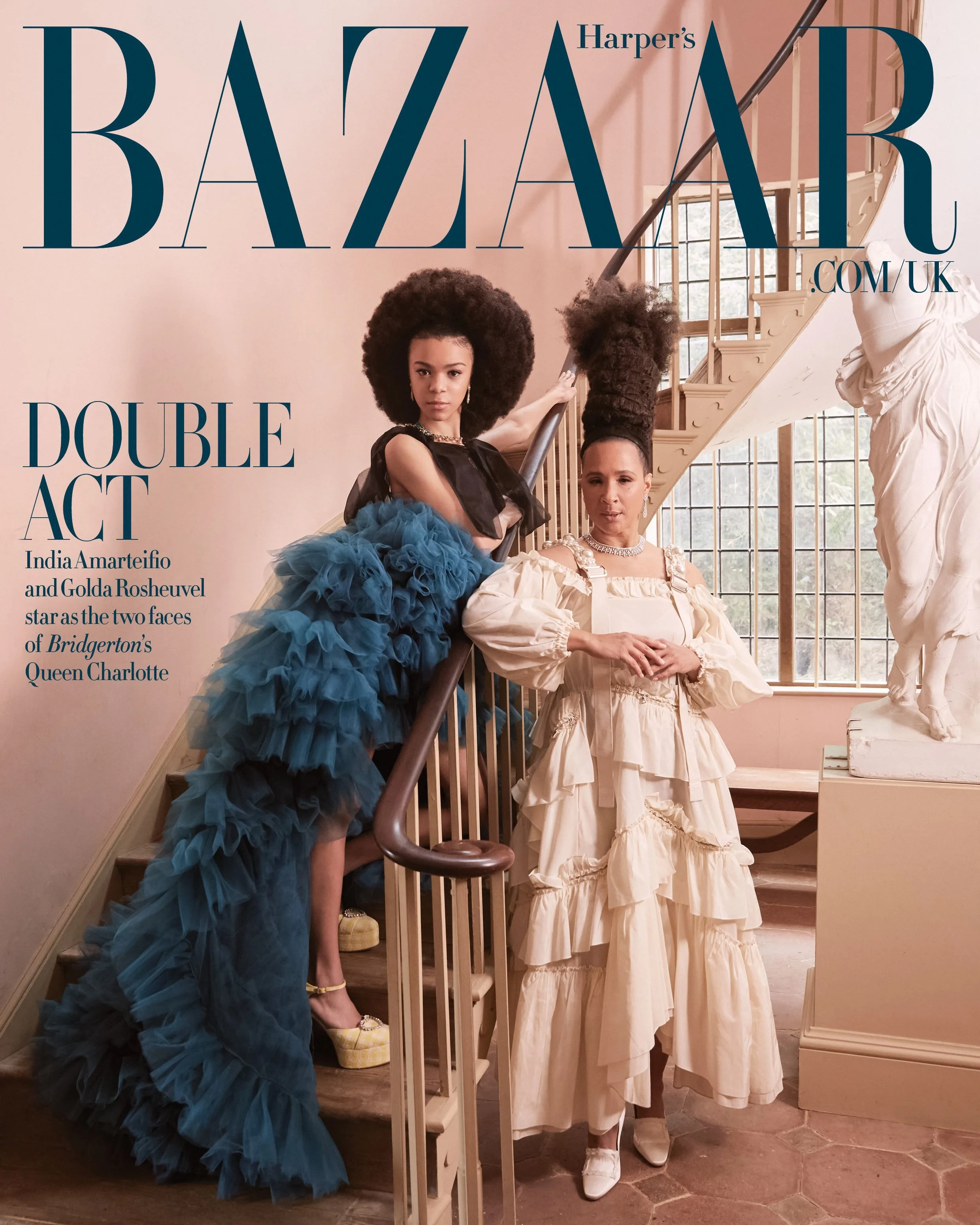 Miranda Almond styles the two actors in ‘Power Play’, lensed by Luc Braquet [IG] for Harper’s Bazaar UK’s [IG] June 2023 issue./ Hair by Dionne Smith & Nicola Harrowell; makeup by Kenneth Soh & Claire de Graft