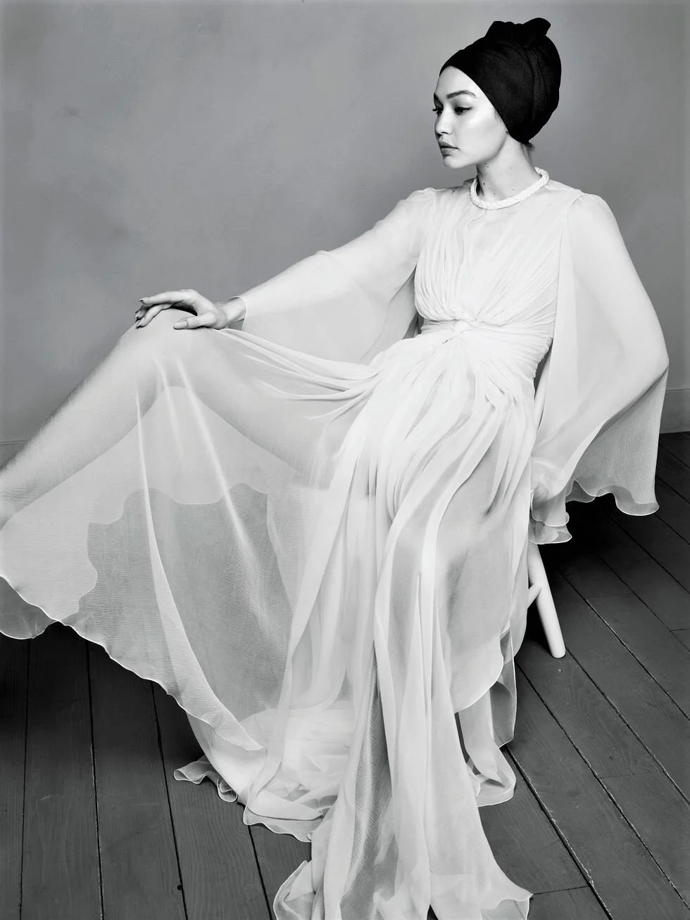 /Gigi Hadid covers the April 2020 issue of Harper’s Bazaar US. George Cortina styles Gigi in a head wrap from Madam Grés and finery from Armani Privé, Chanel Haute Couture, Dior Haute Couture, Givenchy Haute Couture, Maison Margiels Artisanal, Valentino Haute Couture and more. Photographer Solve Sundsbo is in the studio, capturing Gigi in her Giambattista Vali Hautue Couture mask for the fashion shoot.