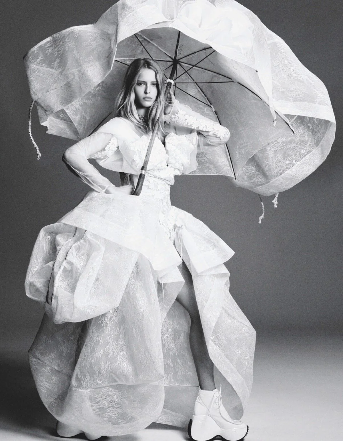 /Models Abby Champion, Bente Oort, Hannah Motler and Mika Schneider are styled by Anna Dello Russo in ‘Simply Beautiful’, a collection of floaty dress-up looks from Andreas Kronthaler for Vivienne Westwood, Chloe, Louis Vuitton, Jil Sander, Miu Miu, Noir Kei Ninomiya, Tomo Koizumi and more.