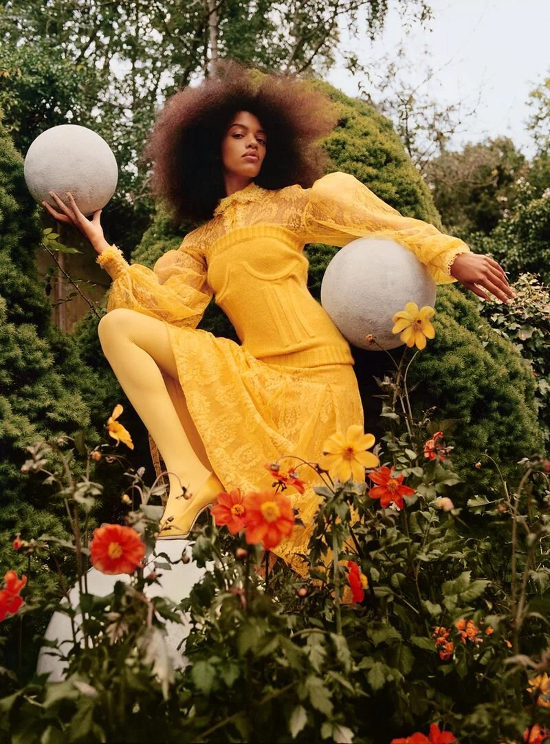 Rising model Kukua Williams is styled by Tona Stell for ‘In Full Bloom’, a flower power, fashion extravaganza lensed by Rory Payne for Telegraph Luxury September 2020./ Set design by Trish Stephenson; makeup by Jenny Coombs