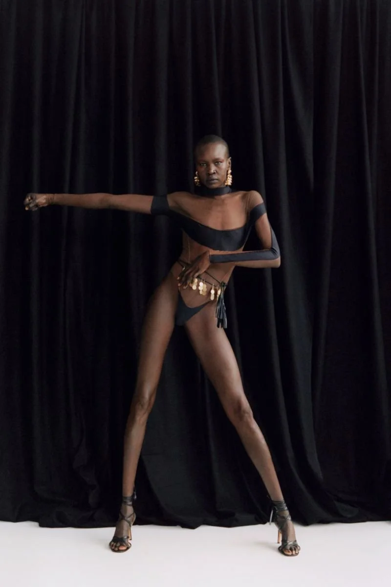 Model Alek Wek is styled by Thistle Brown in black Mugler little bits with fabulous earrings from New York Vintage. Hart Leshkina [IG] captures Wek for SSAW Magazine’s A/W 2021 issue./ Hair by Dylan Chavles; makeup by Janessa Pare