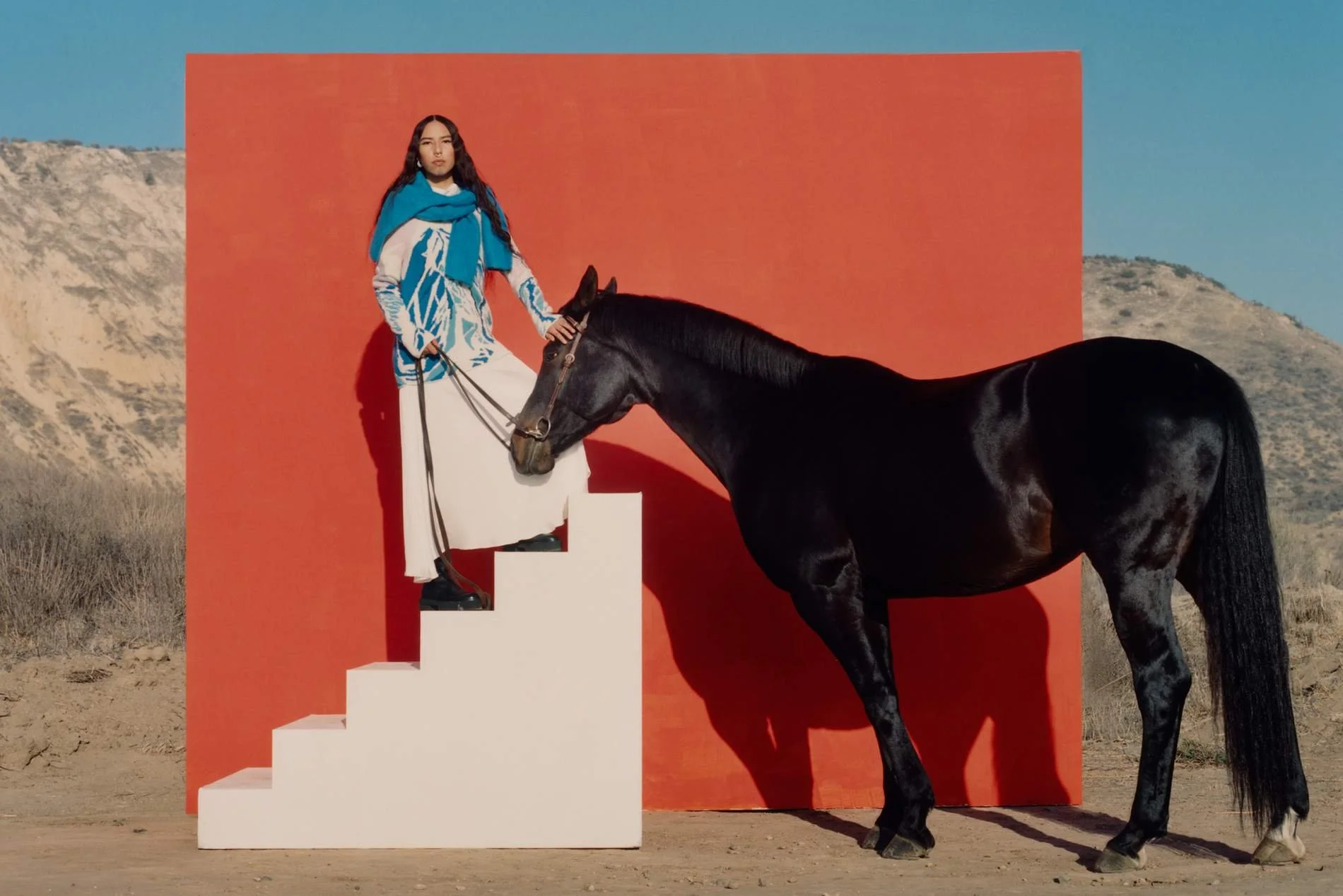 “[Gabriela] truly believes in her work and sustainability and being real with that,” says Chasinghorse. “And uplifting more Indigenous people – collaborating and working with Indigenous people instead of culturally appropriating, which is very, very important. Bringing in Native American models to model [the collection] was beautiful, and I felt so honored to be a part of that.”