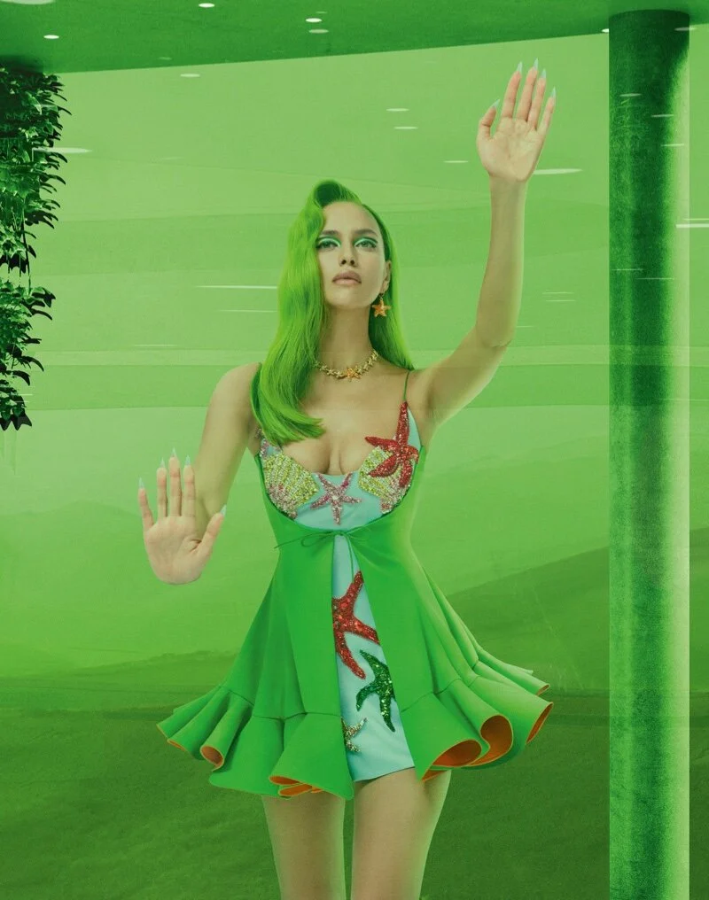 /Top model Irina Shayk covers the March 2021 issue of Vogue Russia, taking nature’s favorite color of green and infusing it with a jolt of stylish modernism. Shayk wears Bottega Veneta on the cover, with interior ‘Neon Demon’ shots by Arseny Jabiev [IG] of futuristic fashion from Chanel, Louis Vuitton, Versace and more. Patrick Mackie styles the shoot with creative direction by Harry Nuriev./ Hair by Jacob Rosenberg; makeup by Tatyana Makarova; set design by Two Hawks Young