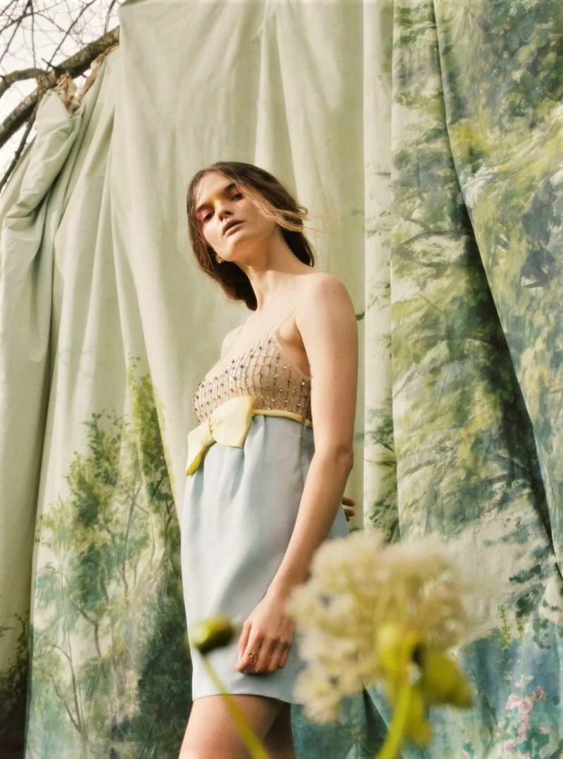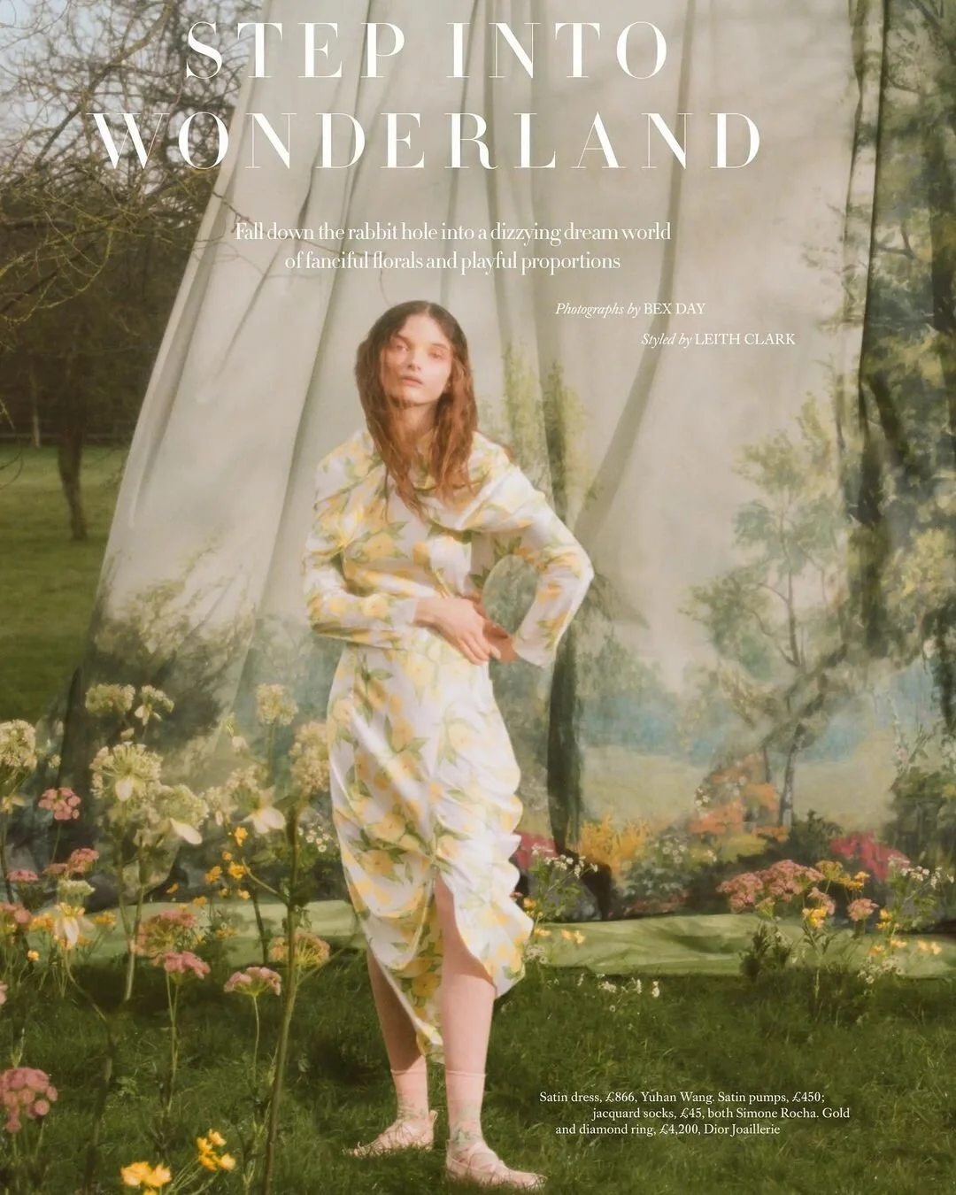 Model Primrose Archer is styled by Leith Clark in ‘Step Into Wonderland’ , romantic floral and fluid fashion lensed by Bex Day {IG] for Harper’s Bazaar UK May 2021./ Hair by Daniel Martin; makeup by Georgina Graham