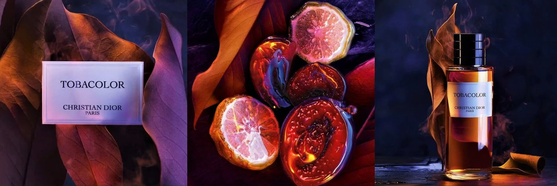 Dior writes: The fragrance name Tobacolor has the ring of a surprising encounter, an invitation to discover the nuances of fresh tobacco tinged with joyful colors. . . . From the blonde tobacco leaves, to the 'gris' tabacco, and dark tobacco blends… Tobacco, with its rich colors and pungent aromas, has inspired joyful new hues for Tobacolor by Maison Christian Dior. The fragrance opens up like a rainbow of colors and senses: the brown nuances of tobacco and shimmering shades of plum and peach blend with the golden tones of honeyed notes.