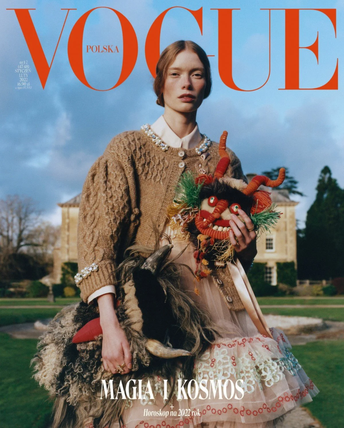 Model Julia Hafstrom covers the January/February 2022 issue of Vogue Poland. Ina Lekiewicz, editor-in-chief, ponders the synergy of fashion and astrology including cyclicality, looking into the future, fascination with ritual and beauty of symbols.