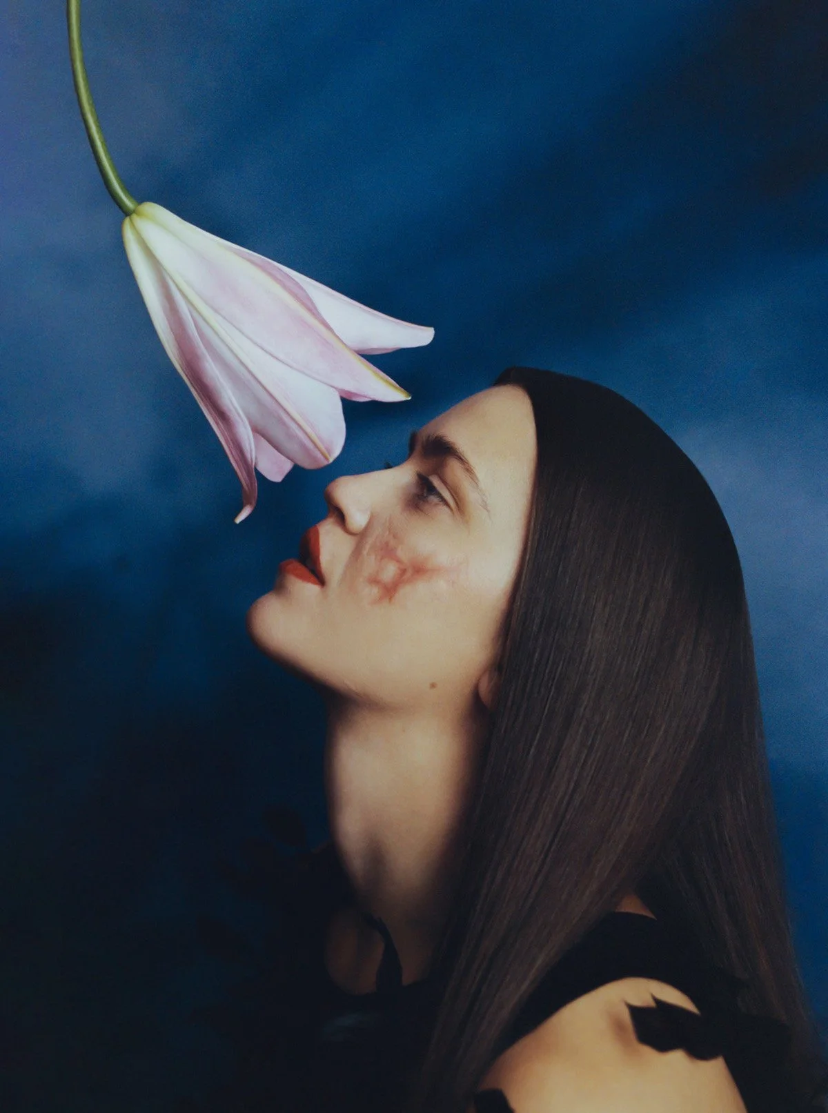 To AOC, the artist Frida Kahlo has entered Giseok’s unconscious, challenging the cast in an engaging romp of running wild artistry. Vanessa Reid styles Veronica in Alberta Feretti, Dsquared2, Giorgio Armani, Max Mara./ Hair by Olivier Schwalader; makeup by Cecile Paravina; set design by Giulia Munari