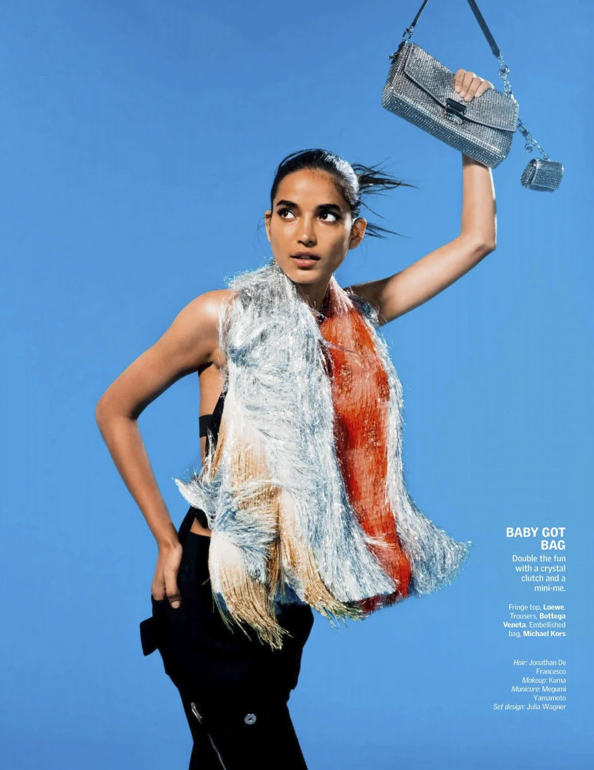 /Model Amrit is styled by Max Ortega in luxury blues and dazzling jewelry from Alexandre Vauthier, Bottega Veneta, Loewe, Louis Vuitton, Prada, Proenza Schouler, Sportmax, Victoria Beckham and more. Photographer Cruz Valdez [IG] captures Amrit in ‘Extra Love’ for Vogue India December 2021./ Jonathan De Francesco; makeup by Kuma