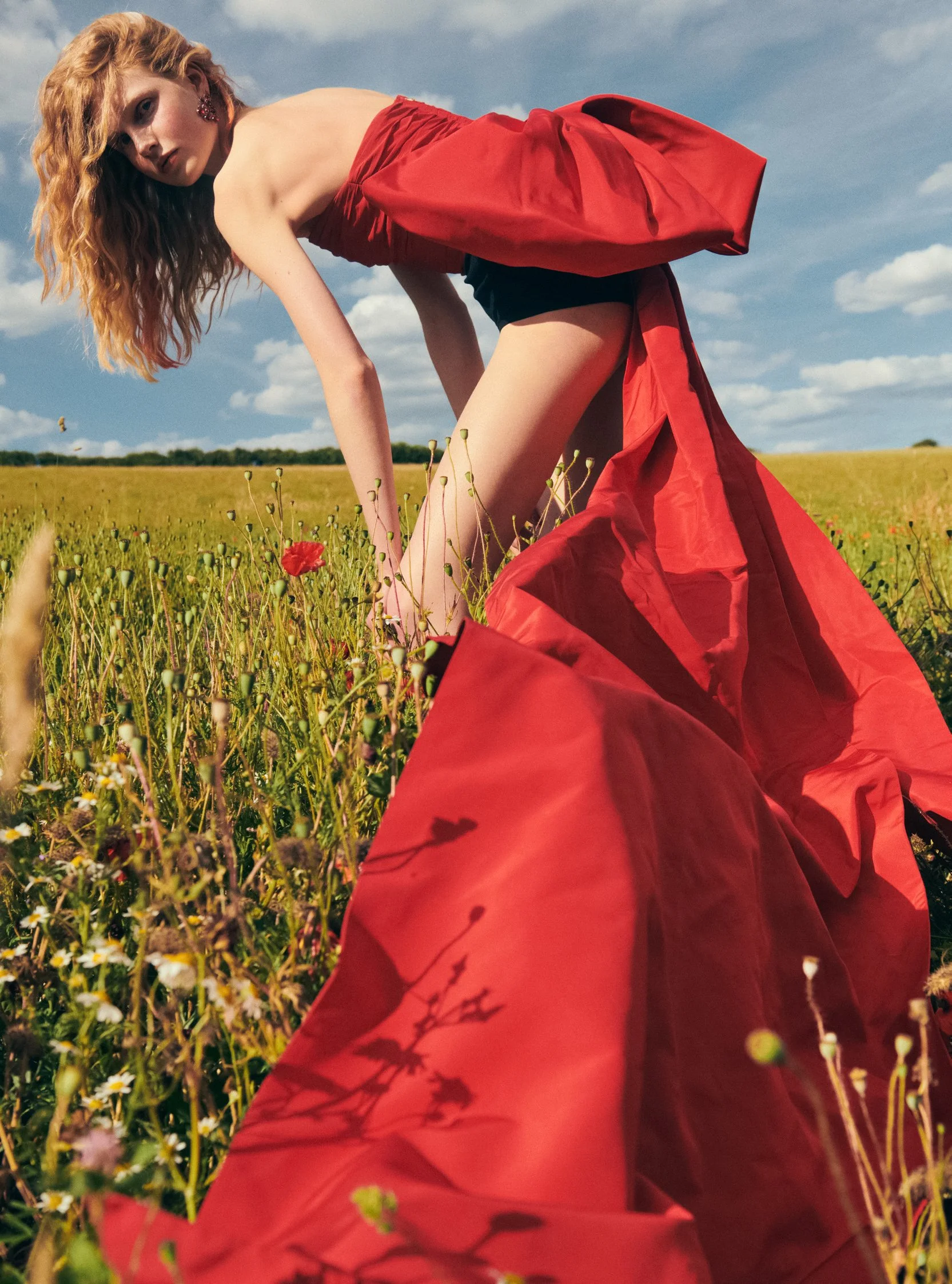 /Rising model Levi Achthoven poses in ‘Field of Dreams’, styled by Miranda Almond in vivid hues of red poppies and other adorments. Photographer Jem Mitchell [IG] captured these gorgeous images of Levi for Harper’s Bazaar UK November women’s artists issue. / Hair by Neil Moodie; makeup by Polly Osmond