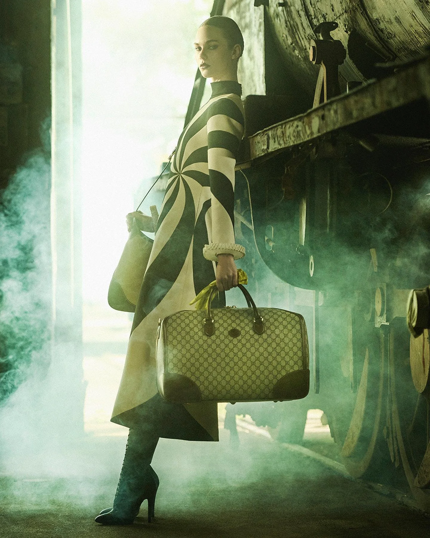 Gucci ‘Valigeria’ train travel also makes an appearance in the December 2022 issue of Vogue Greece. Model Vika Reza is styled by Nicholas Georgiou in images by Panos Davios [IG]. / Hair by Jose Quijano; makeup by Athina Karakitsou