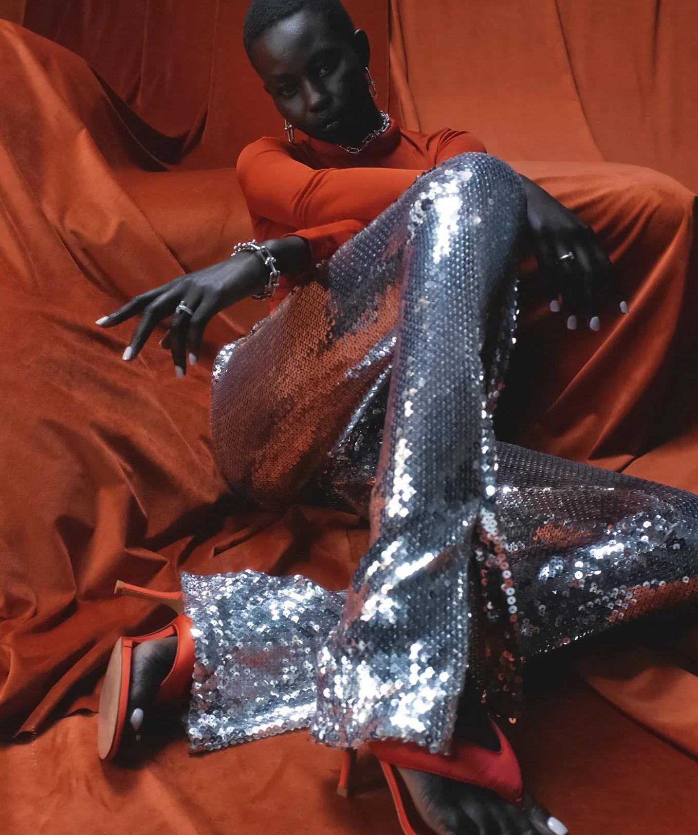 /South Sudanese to Australia model Aweng Chuol has major holiday fashion fever, styled by Petta Chua in ‘Dusk to Dawn’. Photographer Daphne Nguyen [IG] captures Chuol in vivid colors luxe tailored separates for Vogue Australia November 2022./ Hair by Michele MvQuillan; makeup by Kellie Stratton
