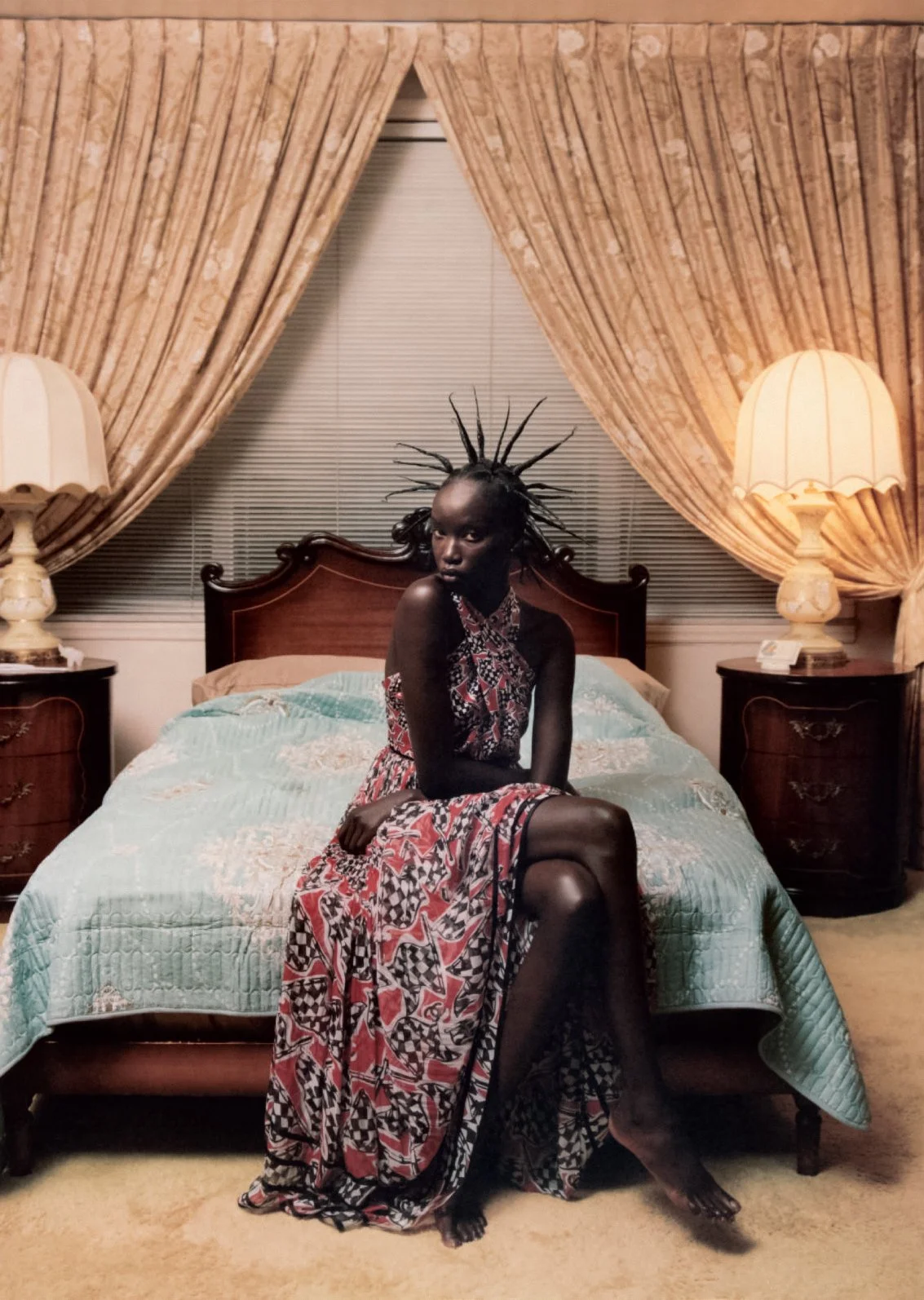 /Anok Yai is styled by Stella Greenspan in ‘Daydream Believer’, lensed by Renell Medrano [IG]for Vogue UK January 2022./ Hair by Evanie Frausto; makeup by Marcelo Gutierrez