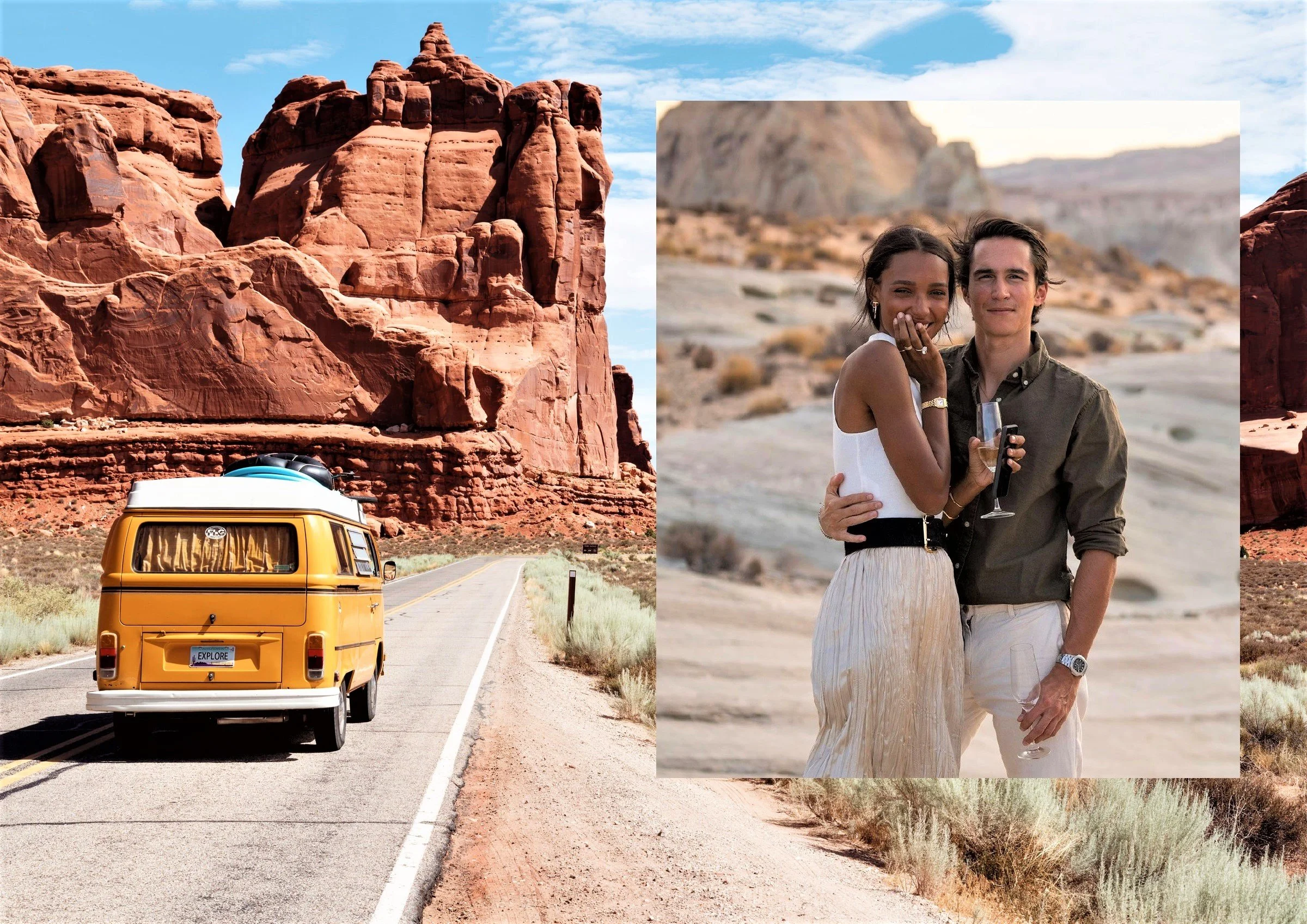 Anne of Carversville is back on the road, powering our way towards Lake Powell. Had we remembered reading about Jasmine Tookes and David Borrero’s extraordinary engagement proposal adventure, we could have sewed up our spiritual glamping search in Navajo country last fall, as intended. Image credit: Background image by Dino Reishmuth Unsplash; Tookes and Borrero via Vogue.