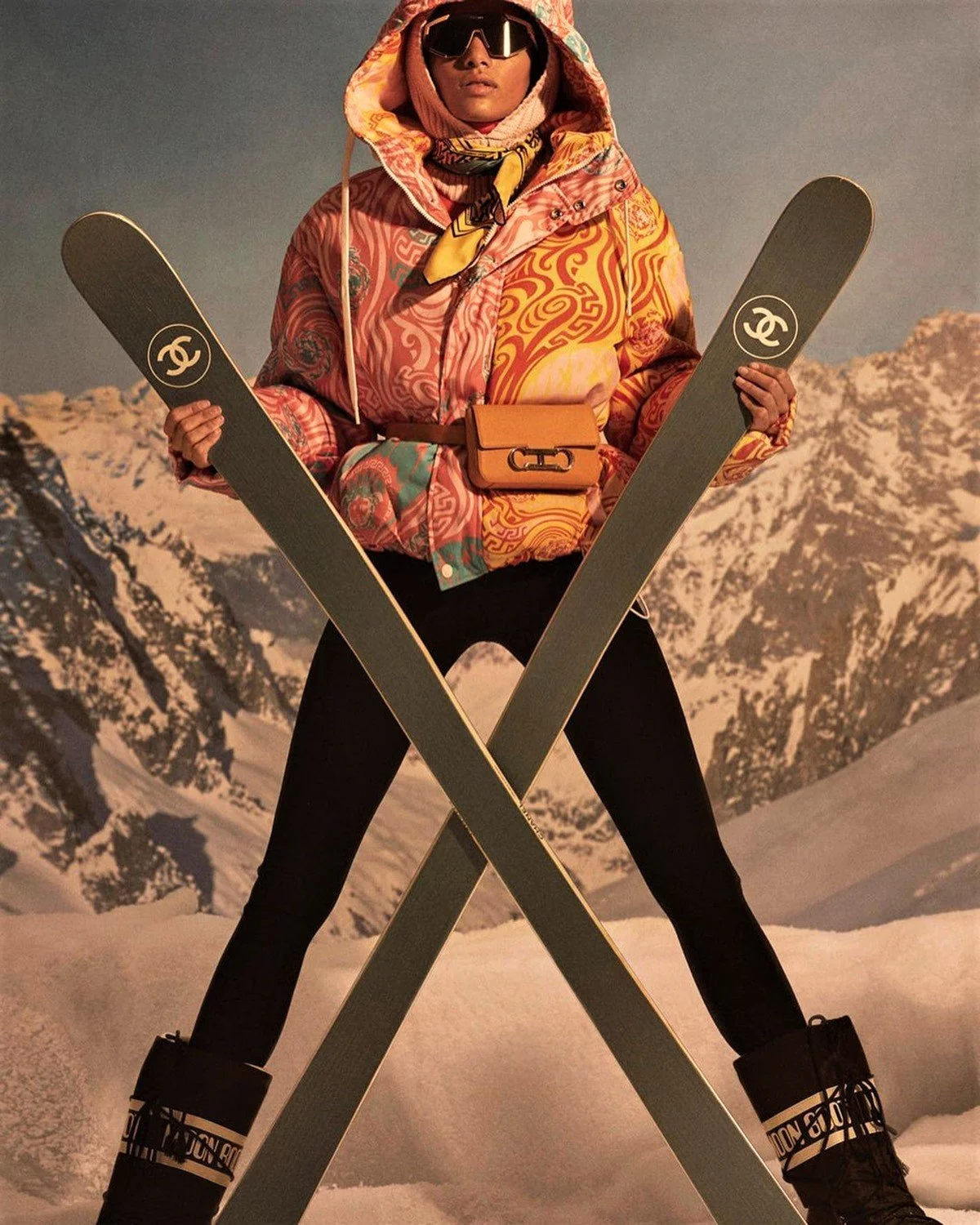 /Model Maria Khan is pure snow bunny, styled by Bárbara Garralda and Sylvia Montoliu in an endless list of luxury brand-ski wear lensed by Mario Sierra [IG] for ELLE Spain January 2022.