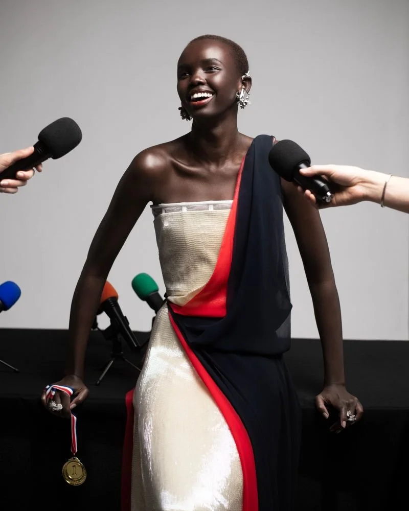Akiima poses in ‘The Haute Couture Games’, styled by Gaultier Desandre Navarre. Pierre Tostain captures Akiima in L’Officiel Italia February 2022.
