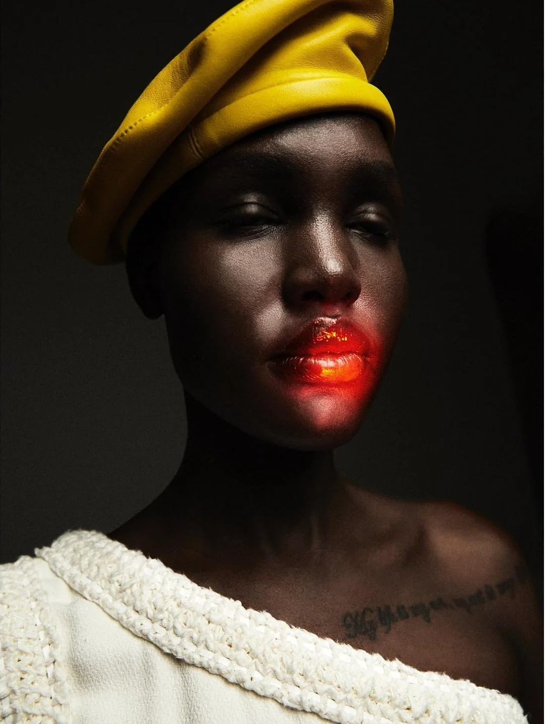 Model Red wears a yellow beret in the January 2022 issue of Vogue Arabia.