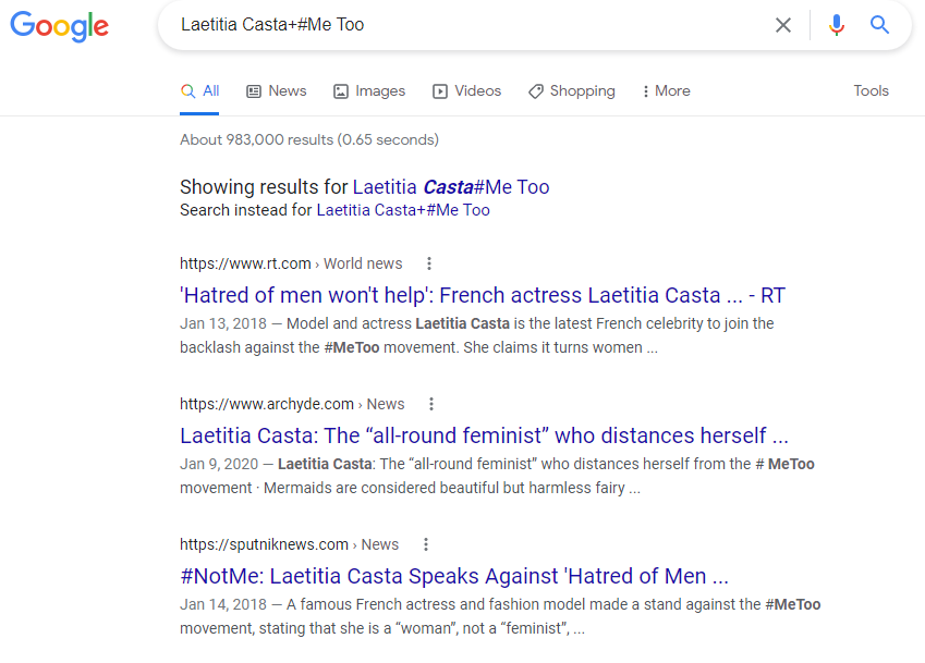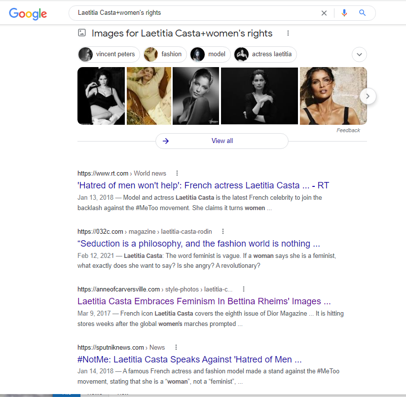 Google page 1 sandwiches Anne of Carversville between RT and Sputnik News on a Laetitia Casta and women’s rights search.