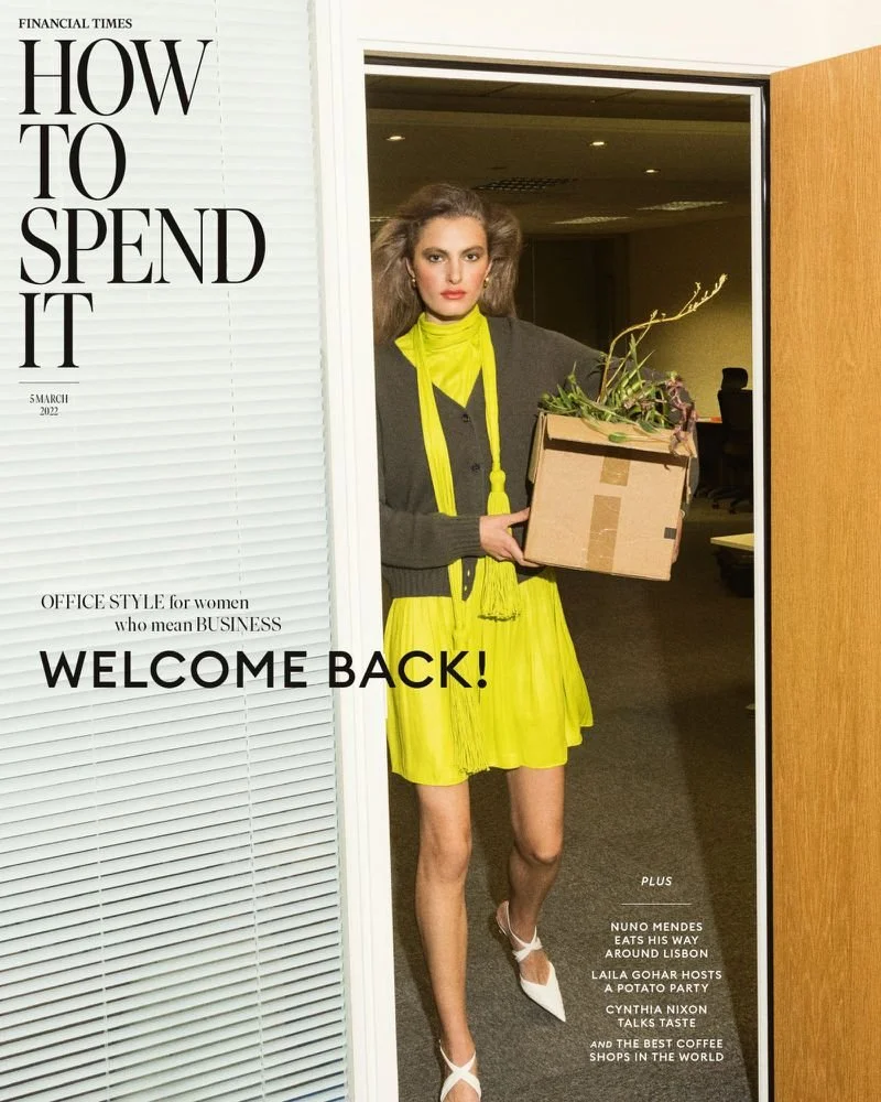 /Model Felice Nova Noordhoff suits up in ‘Haute Desking’ styled by Tamara Rothstein. Andreas Larsson [IG] is behind the lens for The Financial Times HTSI [How To Spend It] Magazine March 2022./ Makeup by Crystabel Riley; set design by Georgina Pragnell