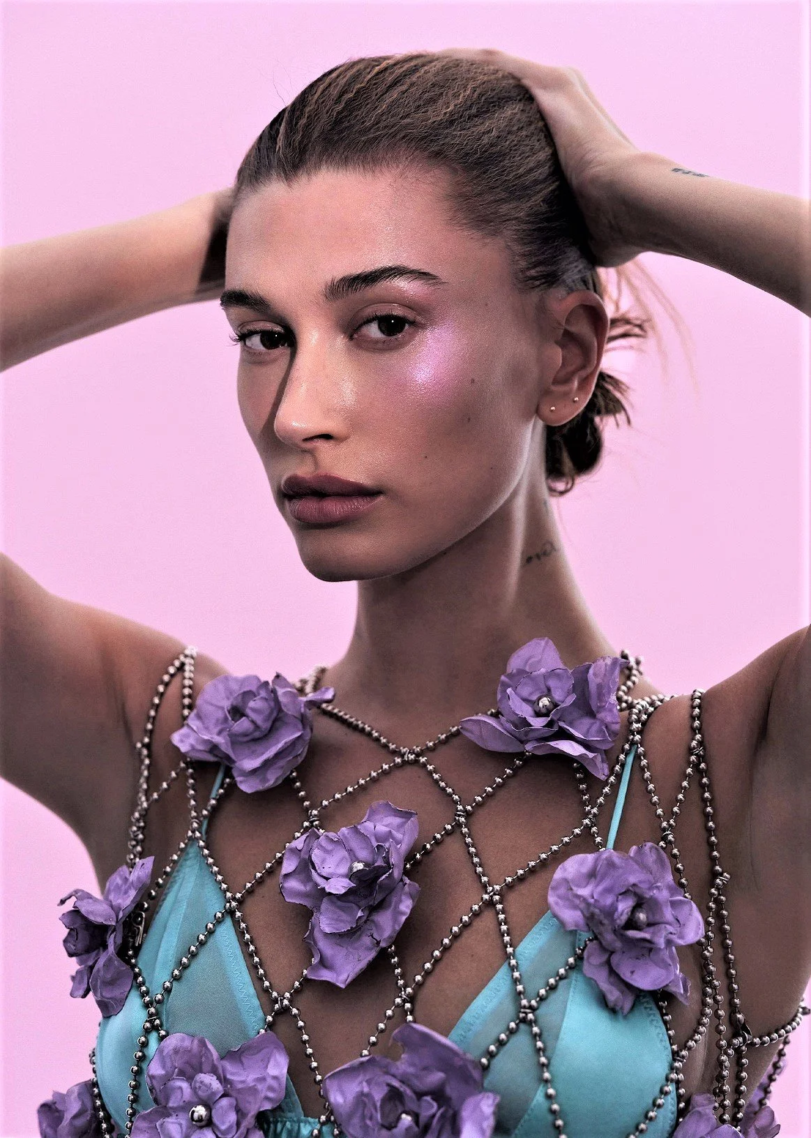 /Top talent and influencer Hailey Bieber is styled by Coco Cassibba in ‘Skin in the Game’, lensed by Zoey Grossman [IG] for Allure Magazine May 2022./ Hair by Bryce Scarlett; makeup by Kali Kennedy