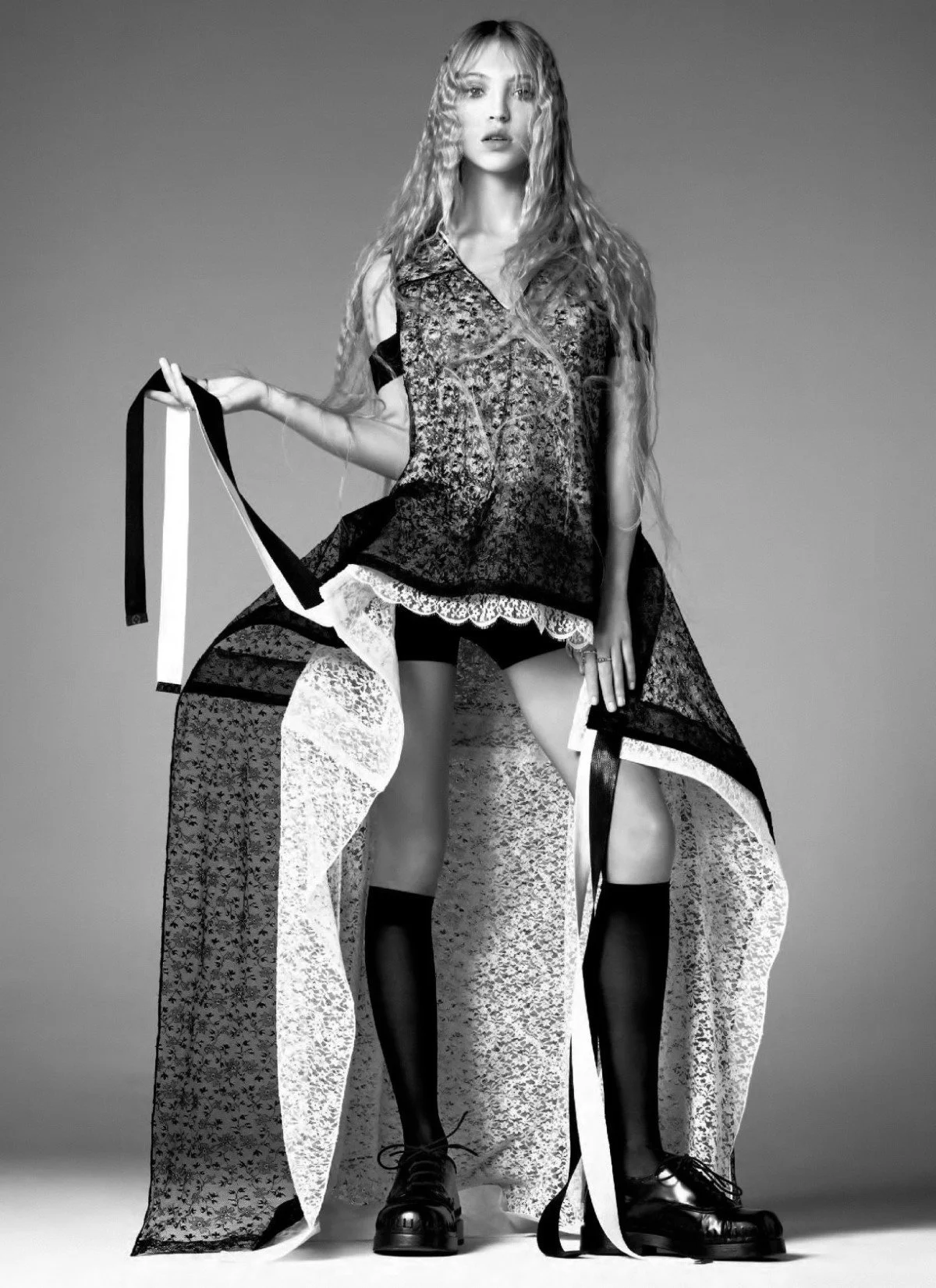 /Rising model Lila Moss takes her first cover of British Vogue, styled by Joe McKenna in fashion fantasy that includes Alberta Ferretti, Dior, Loewe, Prada and more. Steven Meisel captures Moss, daughter of Kate Moss, for the May 2022 issue./ Hair by Guido; makeup by Pat McGrath