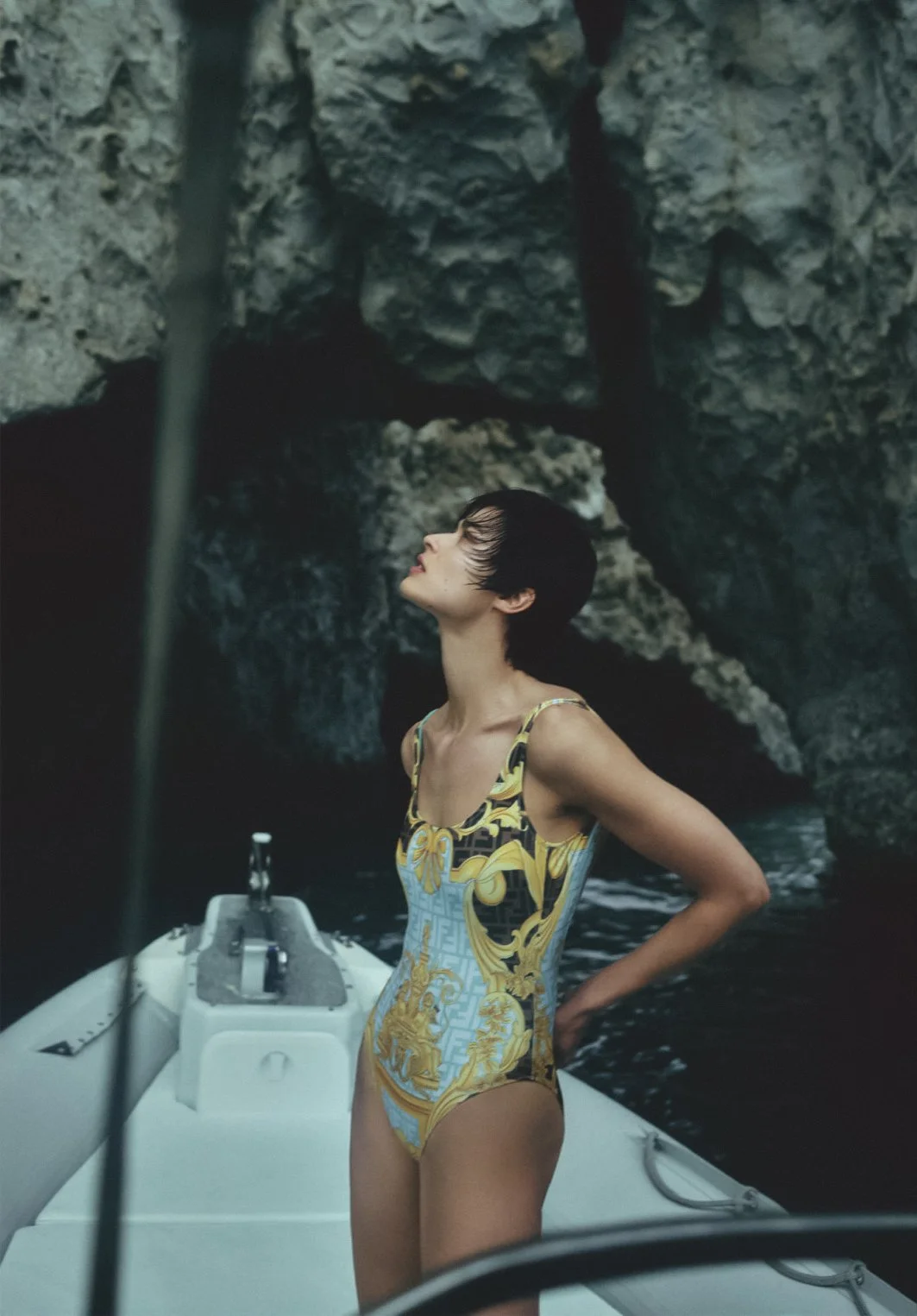 /Dutch fashion model Birgit Kos assumes the sea goddess position, styled by Sandy Armeni in ‘Pure Shores’. Photographer Yulia Gorbachenko [IG] turns her focus to Kos, who fronts the season’s most sophisticated, classic swimwear for Harper’s Bazaar UK [IG] July-August 2022. / Hair by David Harborow; makeup by Kirstin Piggott